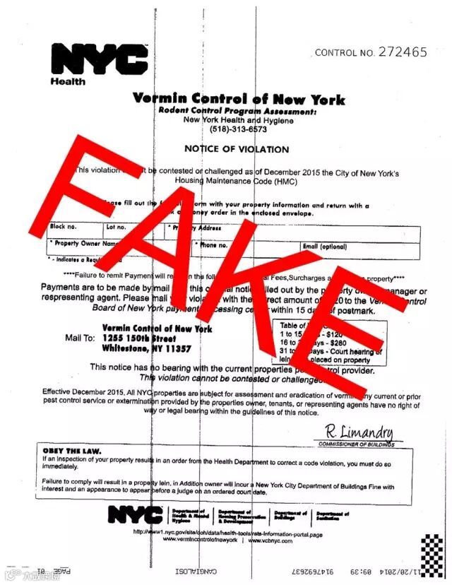 近日,有不法诈骗份子冒充纽约市卫生局(New York City Health Department),向市内居民邮寄虚假的违规罚单,藉以敛财。纽约市卫生局于昨(2日)发出严正声明,指该类型罚单统统为诈骗,呼吁纽约市民警惕,并积极举报。