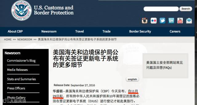 美国海关和边境保护局(CBP)9月28日宣布,自11月29日起,所有持中华人民共和国护照和10年期签证的旅客必须在签证更新电子系统(EVUS)进行登记才能赴美旅行。CBP还公布了一些相关细节。