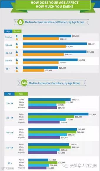 同时,调查还发现,年龄不是影响在美收入的唯一因素,种族和性别也起到非常重要的作用。数据表明,收入中位数的最大差别是呈现在不同种族之间的。在5个年龄段中,除了55-64岁和65+岁两个年龄段,其他3个年龄段中,亚裔表现最佳。