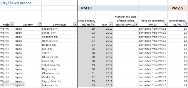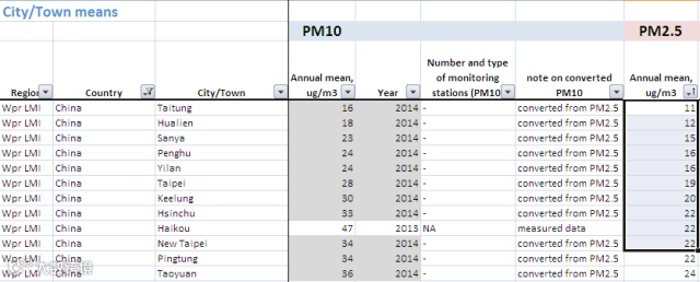 世卫组织的数据库覆盖了103个国家的3000多个城市,在中国,它统计了210个大中小城市的颗粒物和细颗粒物数据。数据来源主要包括各国向世卫组织提交的官方报告、国家和次国家级正式报告以及包含颗粒物或细颗粒物测量结果的网站。