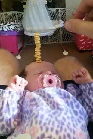 挑战内容说来简单,就是趁萌宝熟睡后把他们的睡颜征用来当爸爸们甜麦圈塔的底座,没想到还真有人玩出了花儿……
