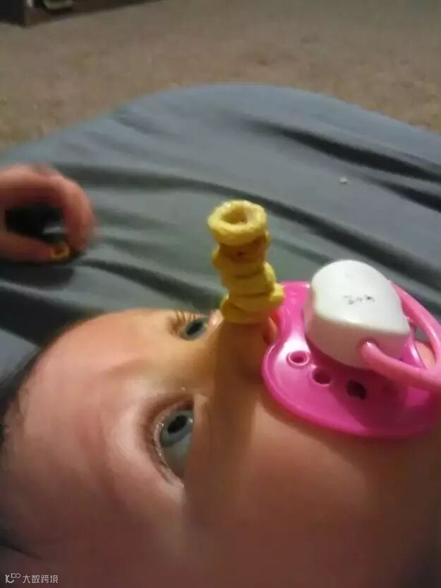 胆大的竟然敢在醒着的宝宝脸上搭建甜麦圈塔,不怕宝宝成对眼儿啊亲爹?