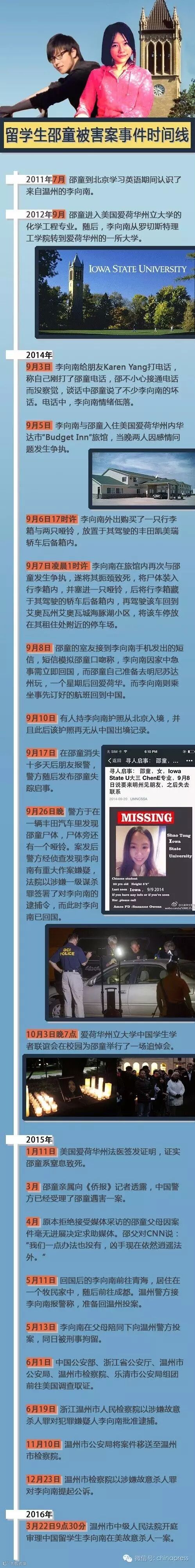 2014年9月26日,美国警方在爱荷华市6号公路旁的小区停车场找到丰田凯美瑞轿车,在车后备厢中发现一具尸体,证实为此前失踪的来自大连的中国留学生邵童。随后美国警方公布调查报告,邵童因窒息而死,嫌疑人正是邵的男友,同样为中国留学生的李向南。
