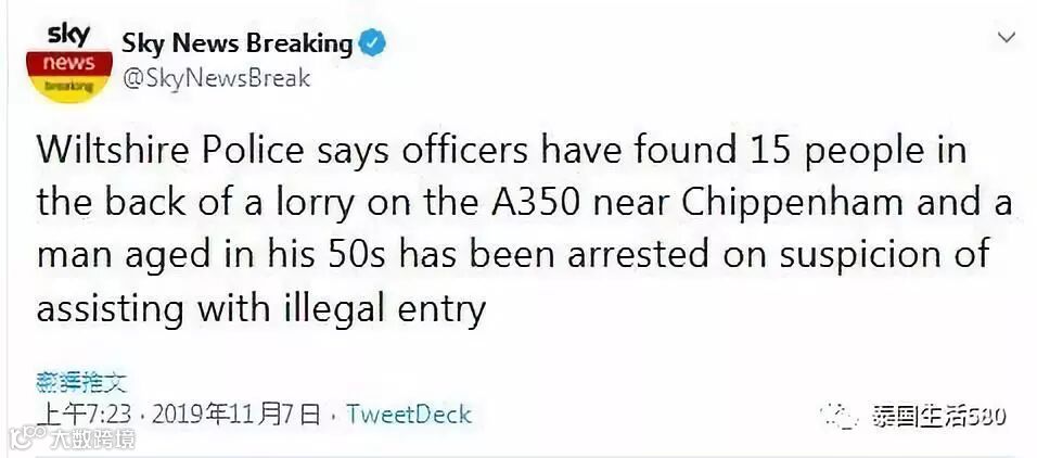 据英国天空新闻刚刚消息,当地时间11月6日,英国威尔特郡警方称,在奇彭纳姆附近的A350公路上的一辆卡车后部发现15名非法移民,一名50多岁男子因涉嫌协助非法入境被捕。