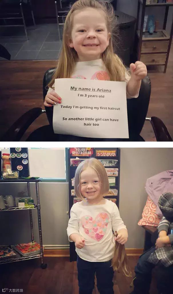 ▼我三岁的女儿看到一个没有头发的女孩问我她为什么是光头。我向女儿解释说因为化疗让她的头发掉光了。然后女儿说:“她可以用我的头发。”