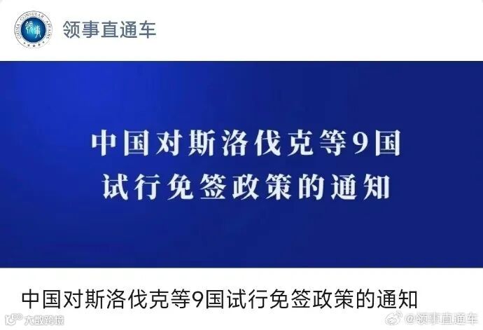 据外交部领事保护中心官方微博“领事直通车”消息,为进一步促进中外人员往来,中方决定扩大免签国家范围,对斯洛伐克、