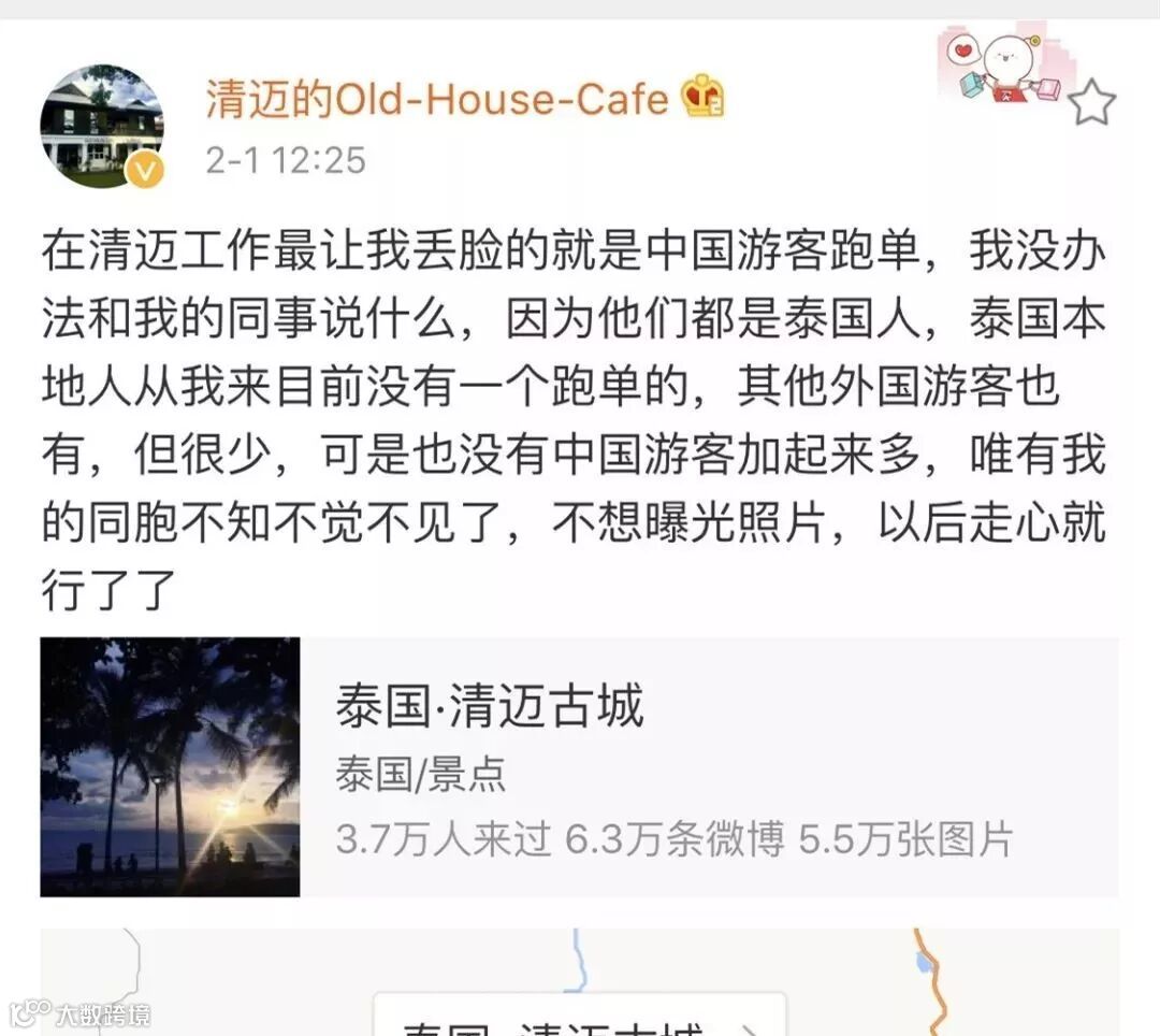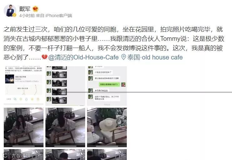 据明星“戴军”在社交媒体上的爆料,近日,两名中国游客在清迈某咖啡厅故意跑单,为了不用付钱,竟把纸巾扔进咖啡里,而整个过程被店内的监控录像记录了下来。
