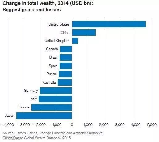 按国家划分,全球最富裕的三个国家分别是美国(85.9万亿美元)、中国(22.8万亿美元)及日本(19.8万亿美元)。