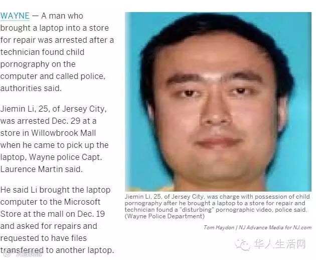 新泽西警长马丁(Laurence Martin)表示,这名被捕的男子名叫李洁民(Jiemin Li,音译),以学生签证的身份住在泽西市。他在去年12月将自己的电脑送到韦恩市Wilowbrook Mall 的一个微软电脑门市部维修,希望技术人员帮助他修理电脑,并转移一些档。技术人员在其电脑中一个名为“重要档”(important documents)的档夹中,发现了一些“令人不安”的儿童色情照片和录像,经理随即通知了警方这一情况。