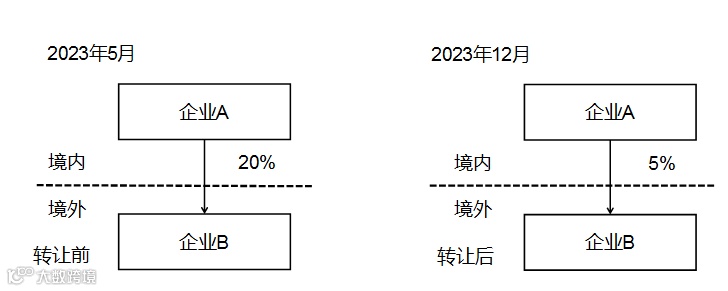 二是若一个纳税年度中间发生股权转让,导致年末持股比例不足10%的,仍需报告被转让境外被投资企业,报告人在填报“外国企业生产经营信息”时,可以填报转让前最近一期的数据。示例4投资架构如下,居民企业A在2023年5月取得外国企业B股份为20%,并于2023年8月转让15%的股份,2023年末持有外国企业B股份为5%,居民企业A在2023年度持有外国企业B的股份超过10%,符合本公告规定条件,居民企业A应就外国企业B填报《报告表》,其中第10栏“报告人持股比例(年末数)”“直接持股”应填写5%。