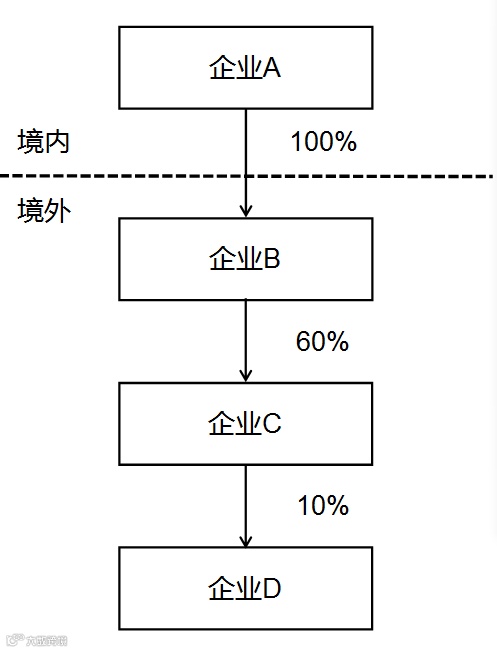 一是在一个纳税年度中的任何一天,被居民企业直接或间接持有股份或有表决权股份达到10%(含)以上的外国企业。居民企业持股比例计算方式按照本公告第二条第二款规定计算,即多层间接持有股份按各层持股比例相乘计算,中间层持有股份超过50%的,按100%计算。示例3投资架构如下,在判断居民企业股东是否达到股份控制标准时,按各层持股比例相乘计算。因外国企业B持有外国企业C的股份比例超过50%应按100%计算,故居民企业A间接持有外国企业D的股份比例为10%,计算公式为100%×100%×10%=10%,符合本公告规定条件。居民企业A应就外国企业B、C和D分别填报《报告表》。