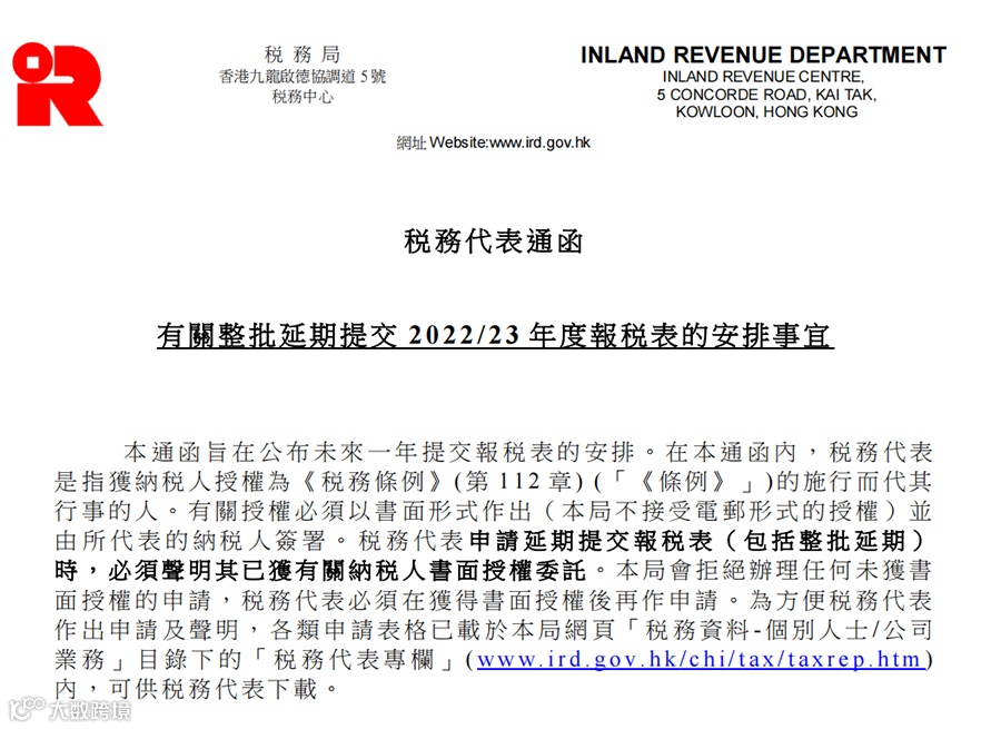 香港税务局局长于2023年3月20日发出通函予各税务代表,公布有关整批/延期提交2022/23年度报税表的安排事宜。