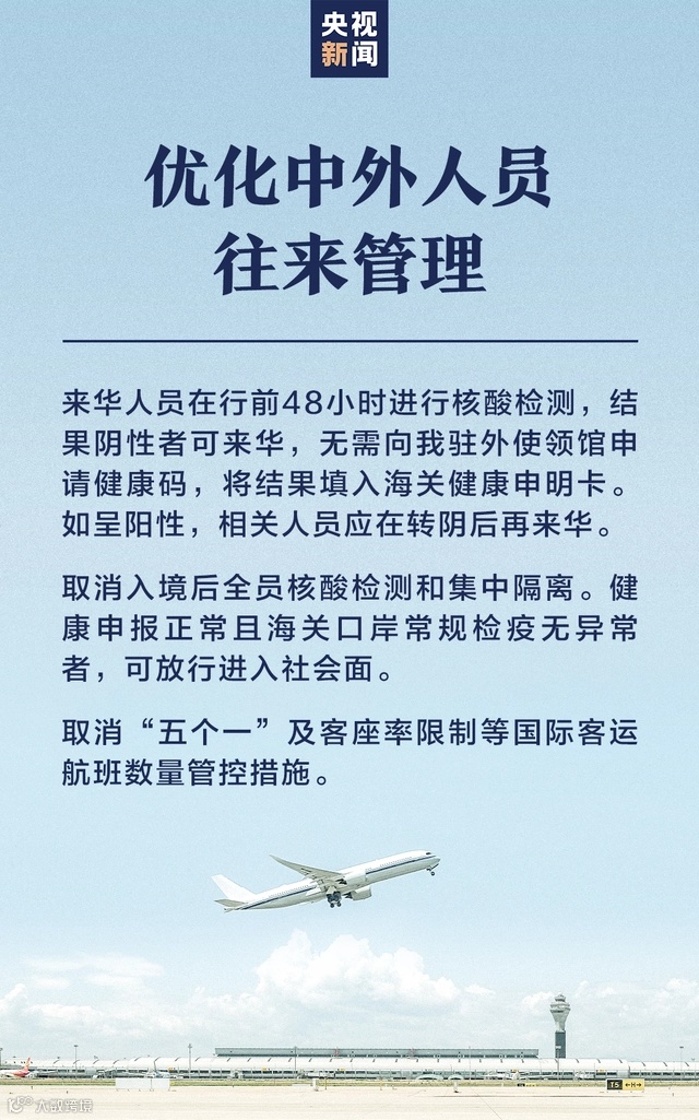 取消“五个一”“一国一策”及客座率限制等国际客运航班数量管控措施,分阶段增加航班数量,优化航线分布。简化机场入境航班处置流程,提高机场运行效率,加强重点城市航班接收能力建设。各航司继续做好机上防疫,乘客乘机时须佩戴口罩。