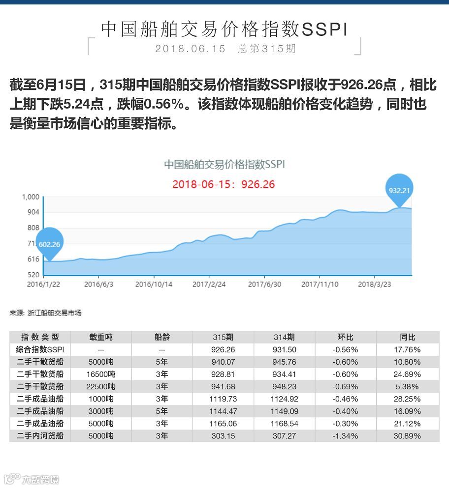 截至6月15日,315期中国船舶交易价格指数SSPI报收于926.26点,相比上期下跌5.24点,跌幅0.56%。该指数体现船舶价格变化趋势,同时也是衡量市场信心的重要指标。
