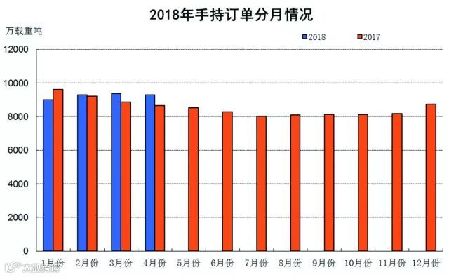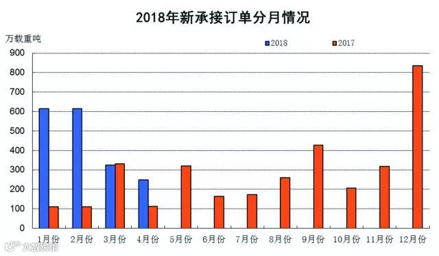 1~4月,全国造船完工1170万载重吨,同比下降37%;承接新船订单1802万载重吨,同比增长171%;4月底,手持船舶订单9301万载重吨,同比增长7.4%,比2017年年底增长6.6%。