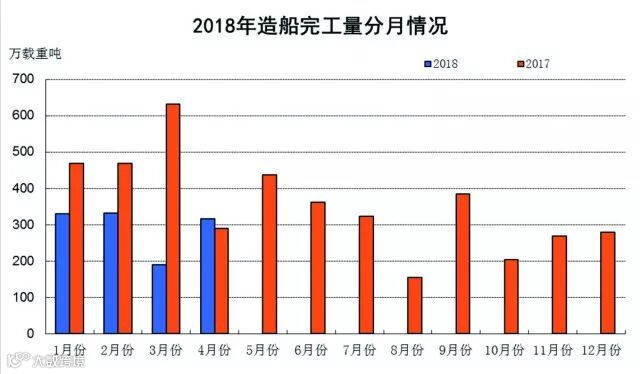 2018年1~4月,我国承接新船订单量继续回升,造船完工量同比下降,重点监测企业工业总产值等主要经济指标连续下降。