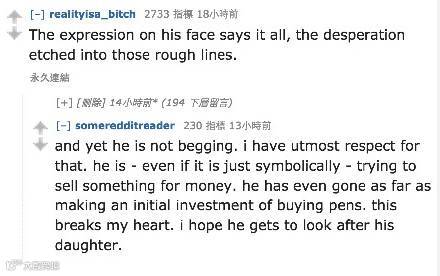 “尽管如此,他也没有乞讨!这是我最敬重的一点。即使是徒劳的,他还是努力地想要靠卖点东西来赚钱。为此他甚至要投入成本购买那些笔。这实在是触动了我的心。我希望他能够照顾好他的女儿。”