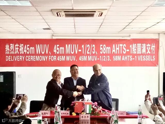 2018年3月27日上午11时18分,江苏南通顺泰基地码头,由武船集团双柳武船承制的45m MUV-1/2/3、45m WUV、58m AHTS-1三型5艘船正式交付。船东方代表AMG(大西洋海事集团为阿拉伯美国石油公司公司)首席运营官Reza,ABS船级社商务经理黄新顺,武船集团双柳武船总经理杨国平等参加了交船仪式。