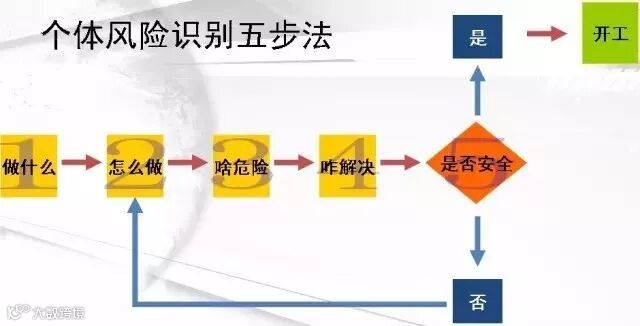 个体风险识别五步法就是一种让工人能够通过自己的观察,自己的判断,来识别出自己要去从事的作业存在哪些危险因素,并形成一种习惯,做到不解决这些因素就不开工的工作方法。