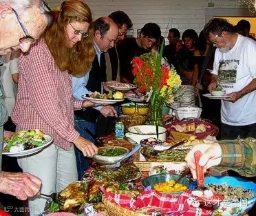 也许正是美国人不愿意在吃上花太多时间,才让“Potluck”流行起来吧。主办这种聚会,主人没有做饭的负重,所以可以常常举办,或者轮流举办。所以美国人的party很多。客人每人带一份菜来,就形成了一个庞大的宴会.食物琳琅满目。每个人能尝到几十种其他人的菜。
