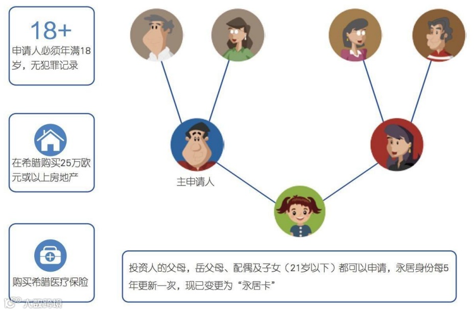 三代移民:主申请人的配偶、父母和21岁以下的子女可以与主申请人同时获得5年的居留身份。