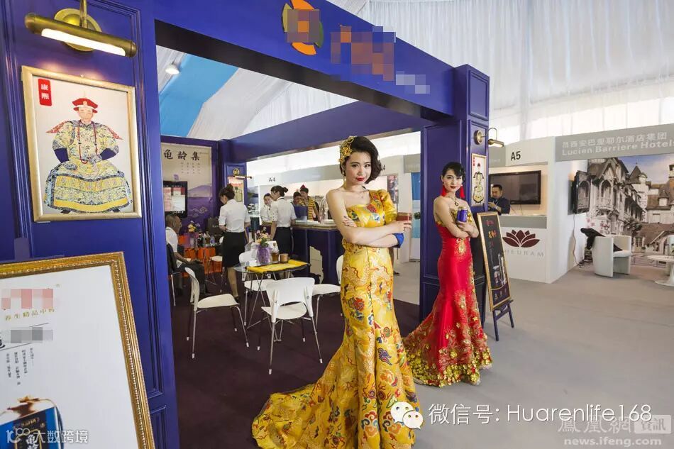 高端中药展位门口的模特。