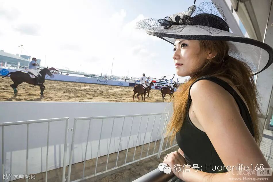 Jamie Wu戴着她的赛马帽子在看第一海滩马球世界杯。