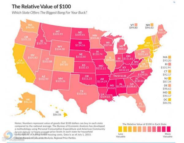 Tax Foundation根据经济分析局的数据发布了一张地图,标明了100美元在每个州的相对全国平均水平而言的实际价值。