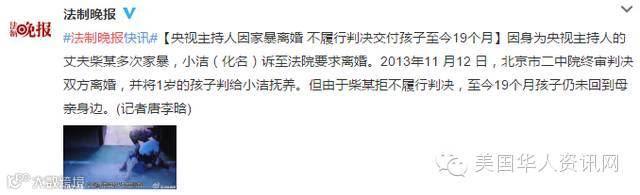 7月5日中午,据法制晚报微博快讯,因身为央视主持人的丈夫柴某多次家暴,小洁(化名)诉至法院要求离婚。2013年11 月12 日,北京市二中院终审判决双方离婚,并将1岁的孩子判给小洁抚养。但由于柴某拒不履行判决,至今19个月孩子仍未回到母亲身边。