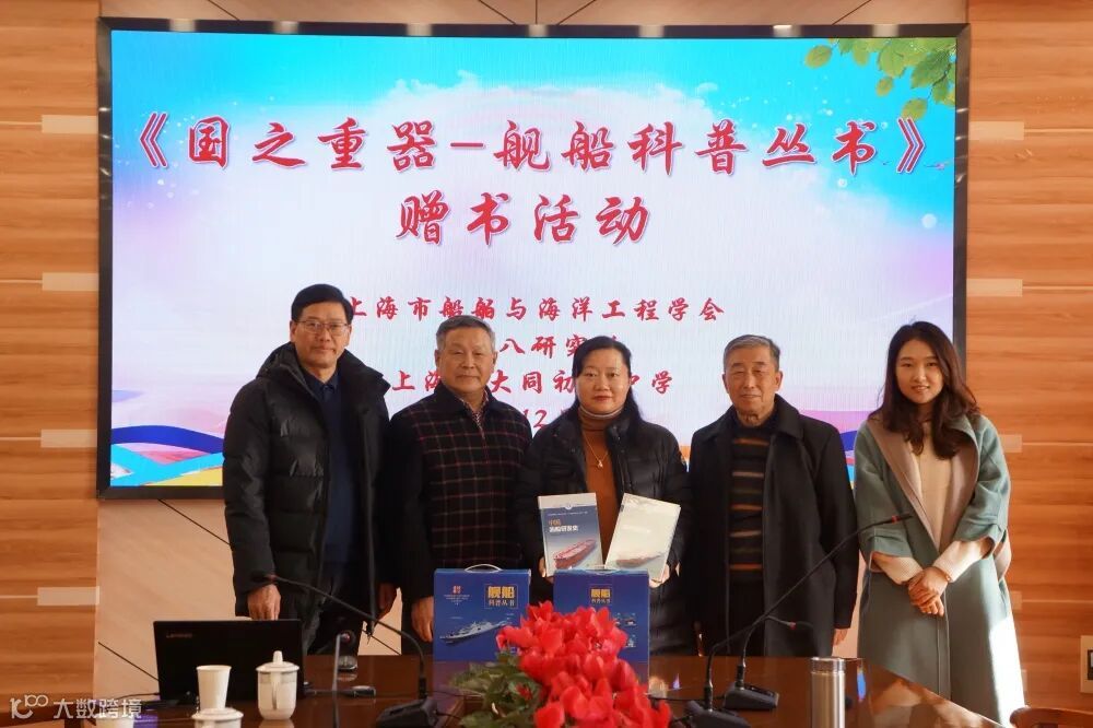 12月17日,学会在上海市大同初级中学举行赠书仪式,秘书长冯学宝与七〇八研究所高级工程师,海上中国梦宣讲团团长张毅一行将《国之重器——舰船科普丛书》送到师生们手中。丛书是由中国船舶及海洋工程设计研究院、上海市船舶与海洋工程学会、上海交通大学联合主编,内容包括中国军用和民用主要船型,旨在增强青少年的海洋和国防意识,普及舰船和海洋工程科学知识。希望同学们在课余时间读好书,好读书。从书中汲取丰富的知识营养,培养舰船知识与兴趣,为建设中国“国之重器”汇聚力量,做出更大的贡献。