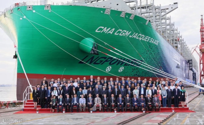 长兴岛造船基地命名交付。中国船舶集团副总经理孙伟、达飞海运集团董事会主席鲁道夫·萨德出席仪式并致辞,教母谭雅·萨德为新船命名,法国驻沪总领事纪博伟应邀出席仪式。