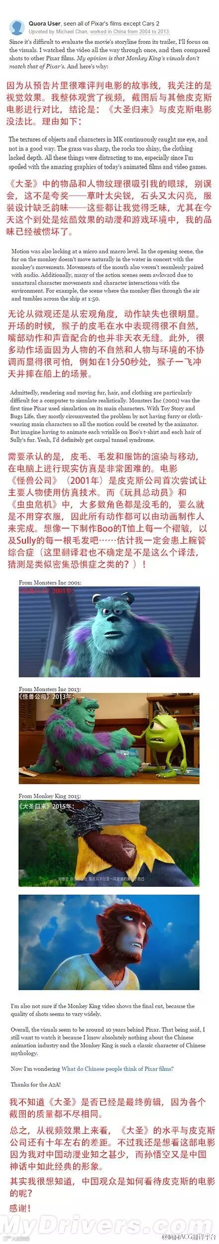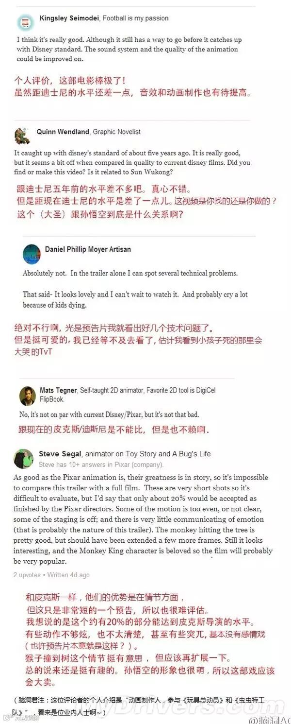 国外知名问答 SNS 网站 Quora 上讨论《大圣归来》的帖子非常火爆,他们有的是绘本作家,有的从事动画业,甚至还有人参与过皮克斯《玩具总动员》的制作,而现在其中一个用户观看后,提出了评论看起来很中肯。
