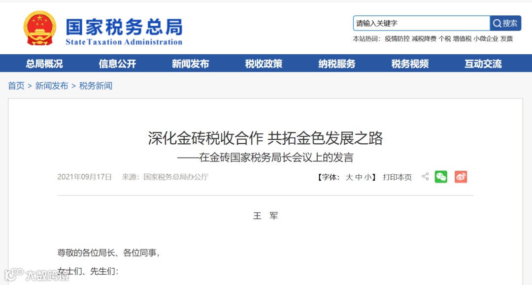 最近,国家税务总局局长在金砖会议上对于金税四期的发言: