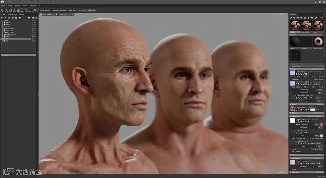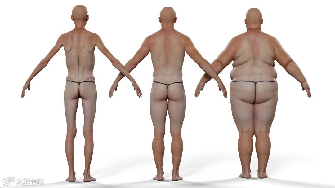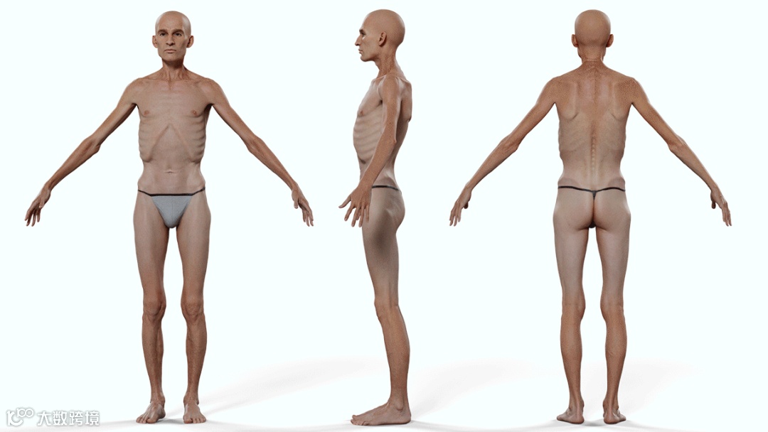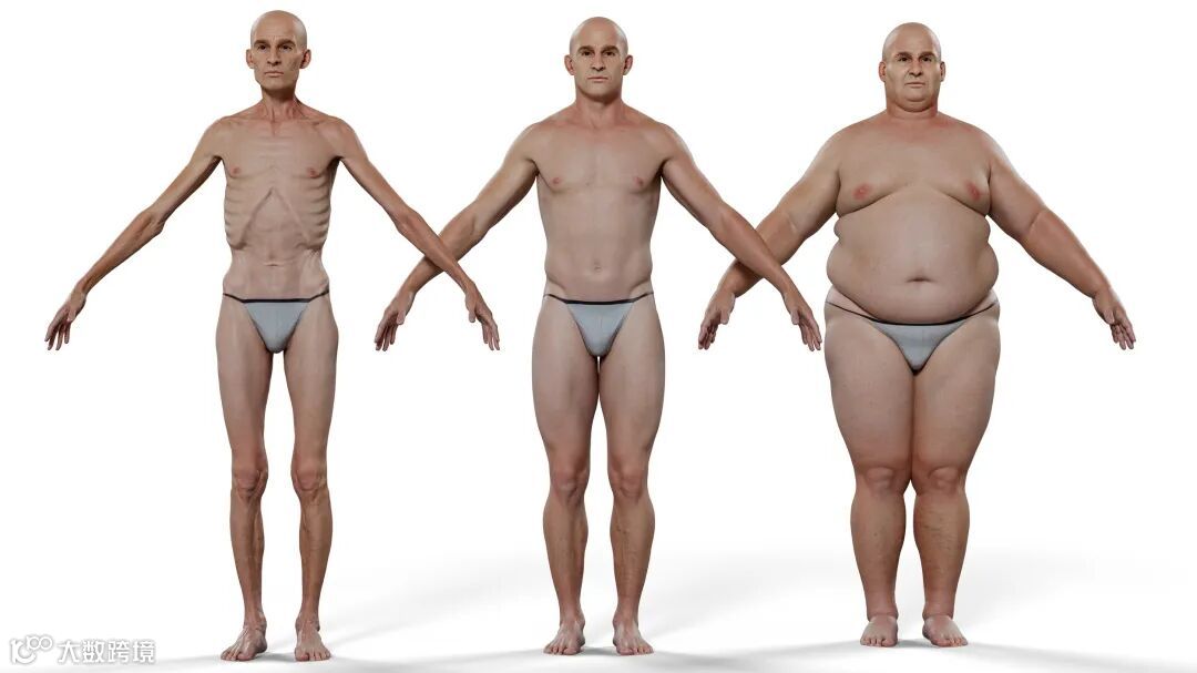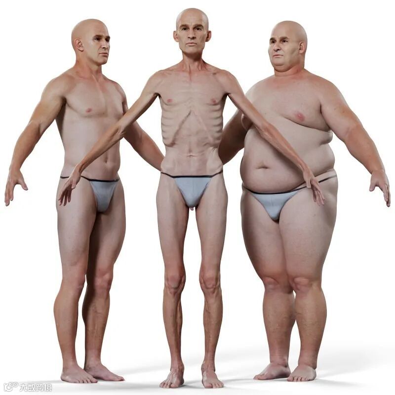我们从瘦到超重的基于扫描的男性基础网格由3个模型组成,这些模型可由Zbursh中的层滑块控制。您可以在体重过轻到平均体重和最终超重或介于两者之间的任何位置之间变化。这是开始构建角色的好方法,只需选择将图层滑块调整到您想要的大小/重量并开始雕刻。这些模型还带有16k颜色贴图和渲染所需的所有辅助控制贴图,包括高光、粗糙度、法线和cavity贴图。我们还包括一个Marmoset Toolbag 4渲染场景,其中包含每个模型的着色器和照明设置。