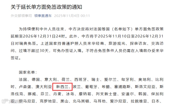 11 月 3 日,中国外交部正式官宣:对新西兰公民的免签入境政策延长至 2026 年 12 月 31 日!