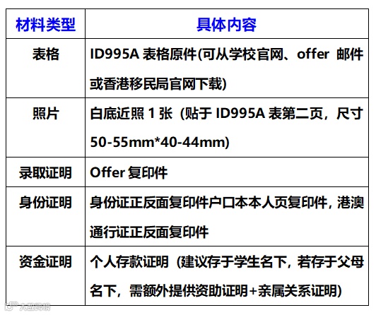 基础表格:ID995A 表格原件(可从学校官网、offer 邮件或香港入境事务处官网下载),记得完整填写并签名,第二页要贴近6个月内的白底证件照(尺寸50-55mm×40-44mm)。