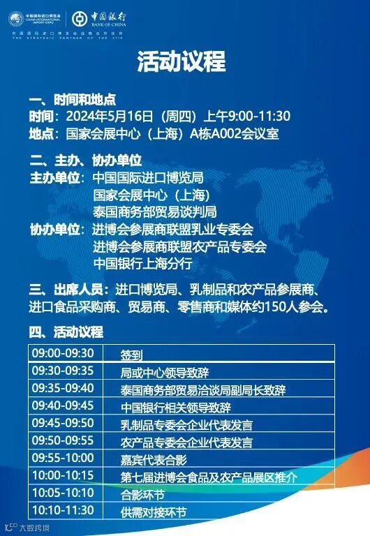 第七届中国国际进口博览会食品及农产品展区乳制品、农产品供需对接活动即将于5月16日9:00-11:30在国家会展中心(上海)A栋A002会议室举行。