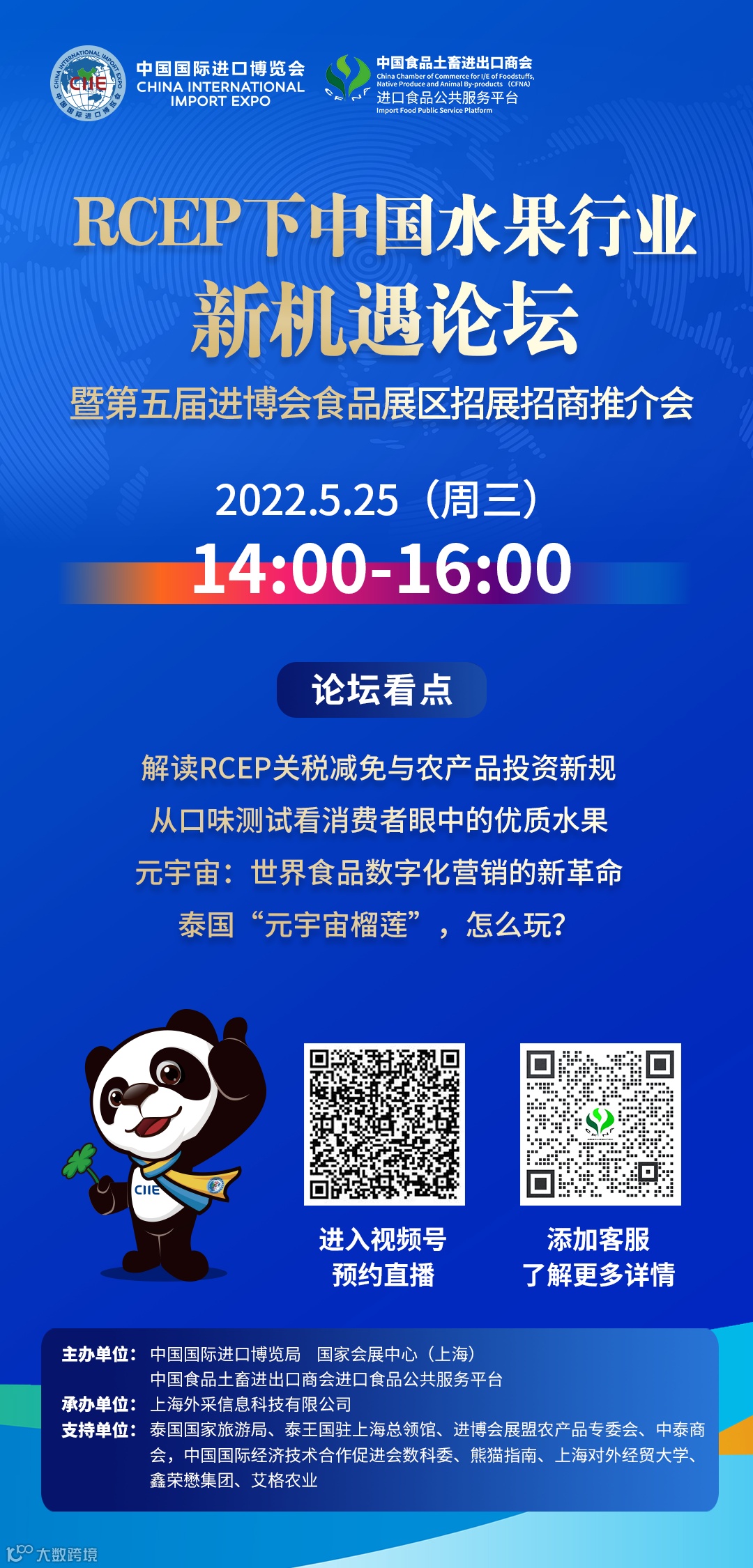 支持单位:泰国国家旅游局、泰王国驻上海总领馆、进博会展盟农产品专委会、中泰商会,中国国际经济技术合作促进会数科委、熊猫指南、上海对外经贸大学、鑫荣懋集团、艾格农业