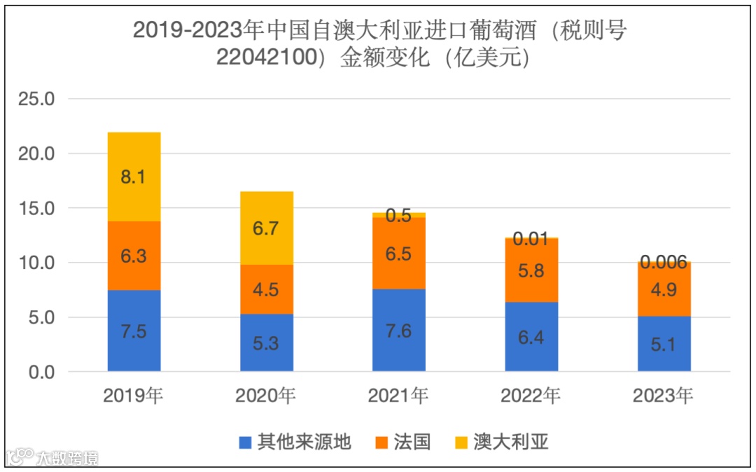 最后,中国进口红酒市场的整体萎缩也是一个不容忽视的现实。从2019年的22亿美元到2023年的10亿美元,中国红酒总进口金额已经下降了50%以上。这一趋势无疑将对澳大利亚红酒在中国的销售产生重大影响。