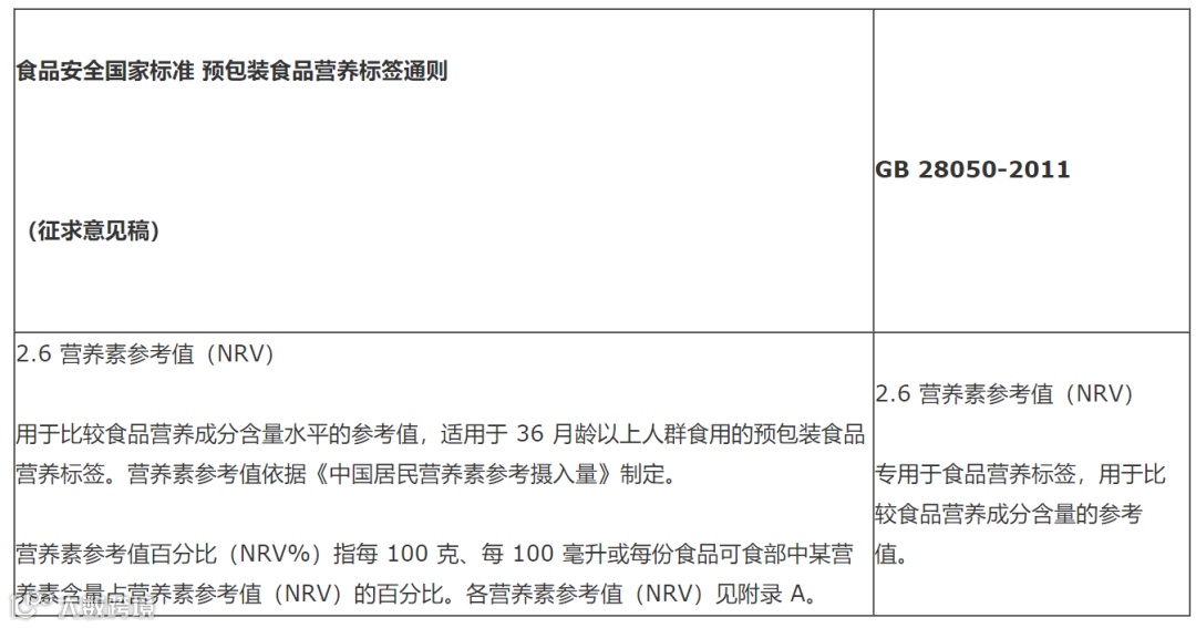 规定NRV 适用于 36 月龄以及以上人群食用的预包装食品营养标签。说明了对NRV 制定的依据,增加了使用方式。
