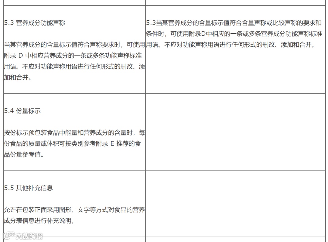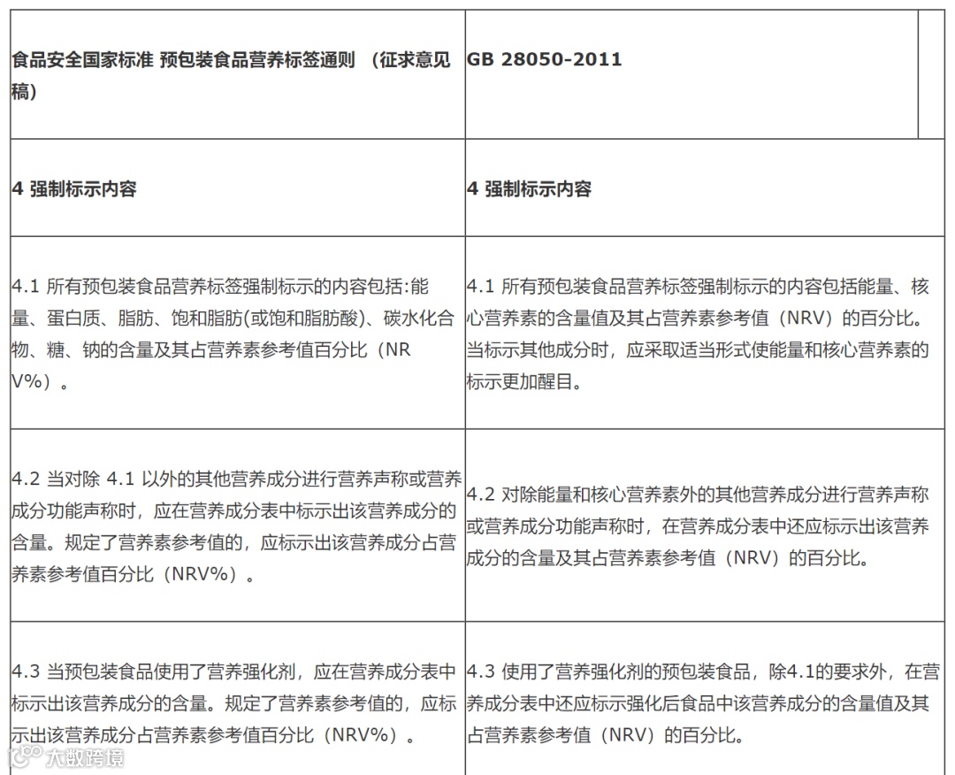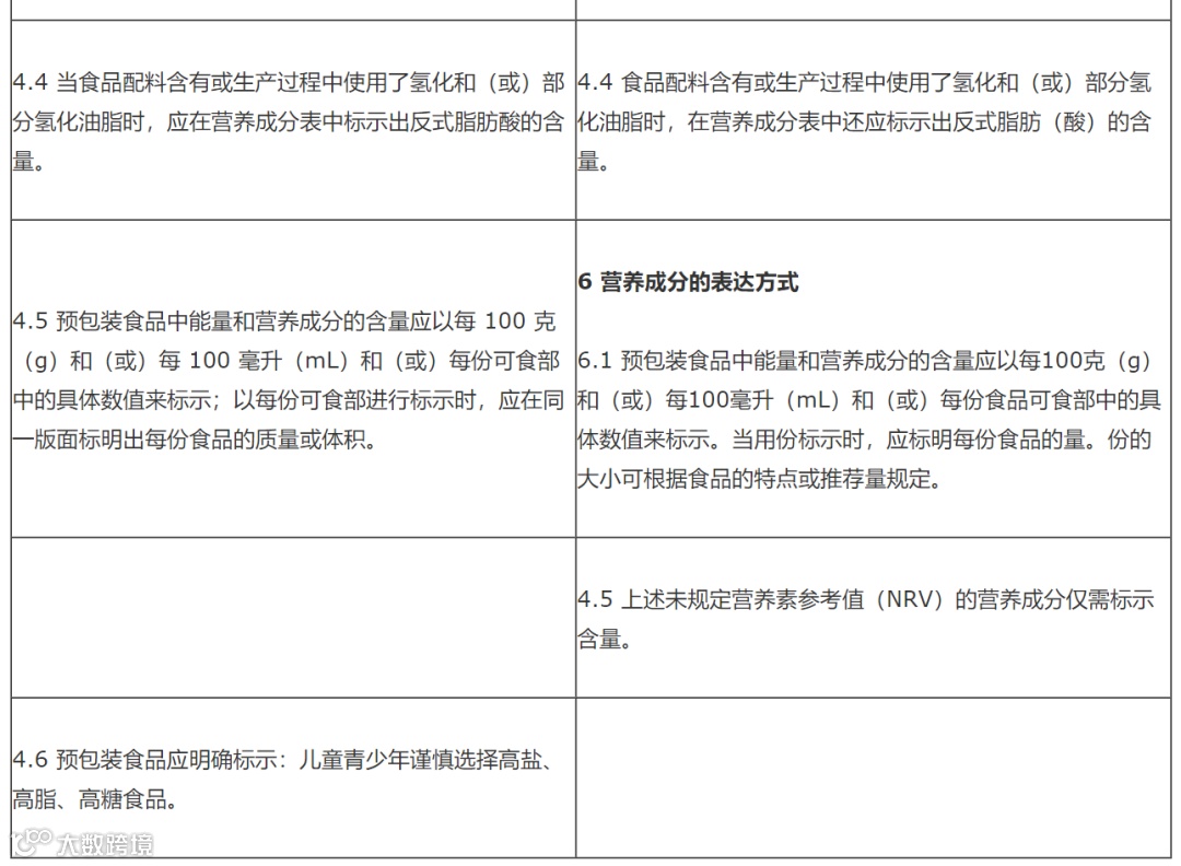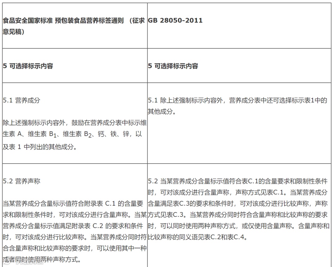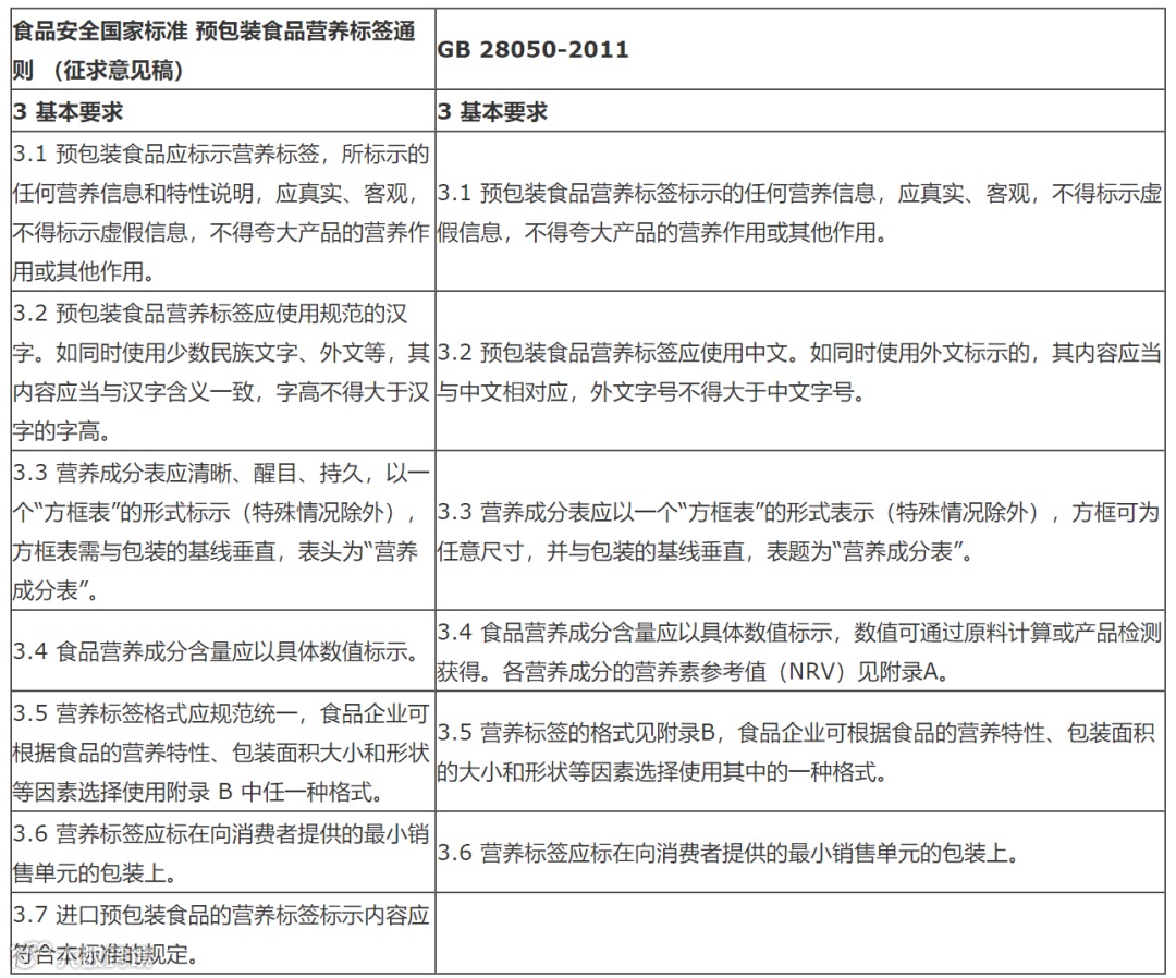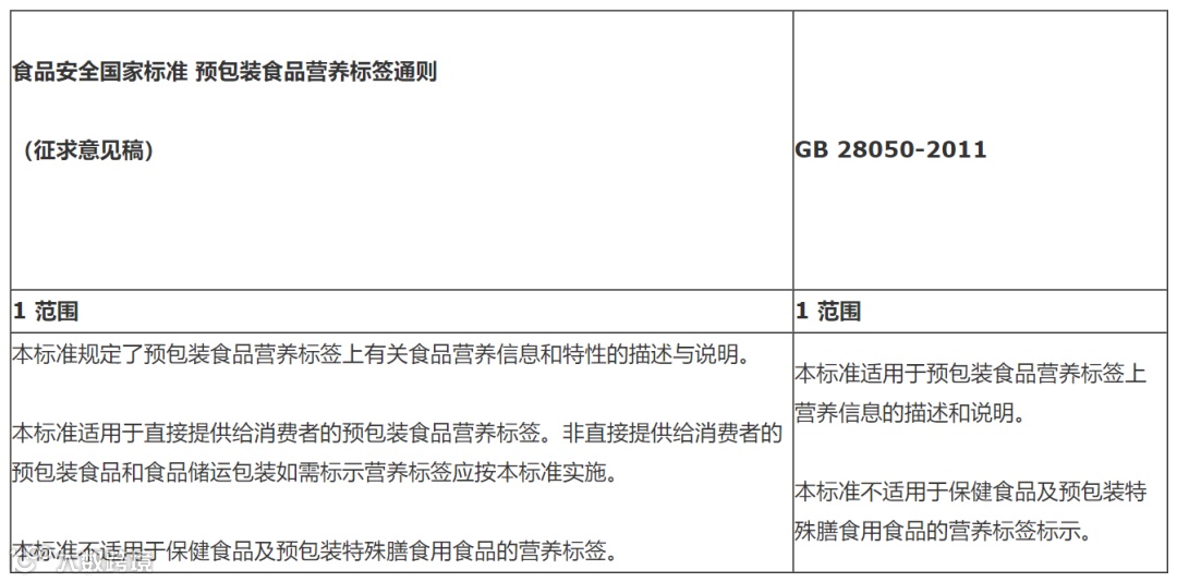 此次征求意见稿的适用范围增加了“本标准适用于直接提供给消费者的预包装食品营养标签。非直接提供给消费者的预包装食品和食品储运包装如需标示营养标签应按本标准实施”。即非直接提供给消费者的预包装食品,可以不进行强制标示要求,但如标示必需应按本标准实施,这也与新发布的GB 7718征求意见稿相一致。