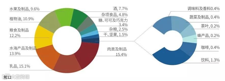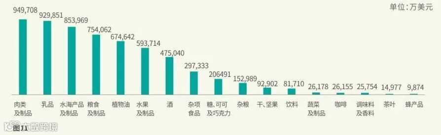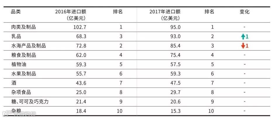 首先,《报告》为我们列出了各大类进口食品的金额与排名。可以看到前三名分别是肉类及制品,乳品、水海产品及制品。进口金额分别达到95.0亿美元、93.0亿美元、85.4亿美元。