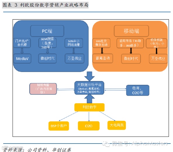 如上图所示,本次收购完成后,利欧数字网络将构建大数据分析平台,数据来源和导流通过电商以及O2O客户等;而琥珀传播则作为广告内容以及策划角色,在为客户描绘广告内容的同时,布局PC端以及移动端;我们也看到公司此后客户主要在O2O类,大电商类,以及DSP精准营销的客户。另外利欧数字网络会将旗下公司的业务线从客户端、服务端再到人员端进行深度一体化整合。随着整合协同效应的凸显,集团在媒体采买、技术研发、客户资源、行业服务等方面的协同运营将不断强化,打造贯穿营销产业链的互联网+,将进一步提升利欧数字网络的综合实力,我们认为公司将成为全新的流量变现者,有望打造全新互联网营销模式,同时给客户服务带来全方位价值体系上的巨大飞跃,助力“互联网+”。