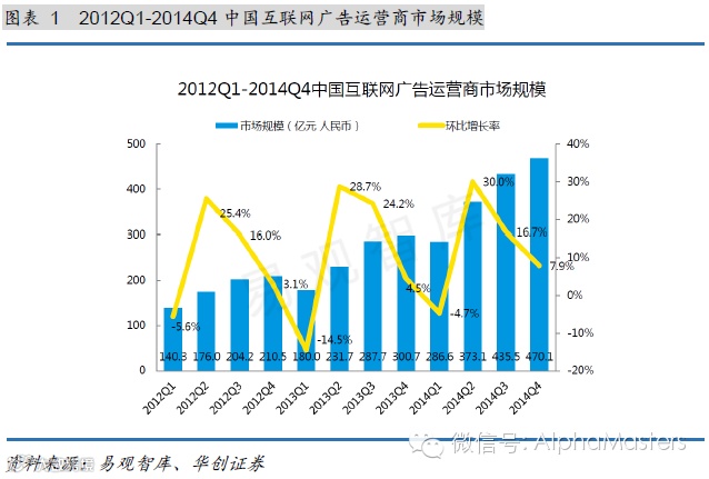 易观智库数据显示,以互联网媒体的广告收入作为统计口径,2014年第4季度中国数字营销市场收入达470.1亿元人民币,较上一季度增长7.9%。
