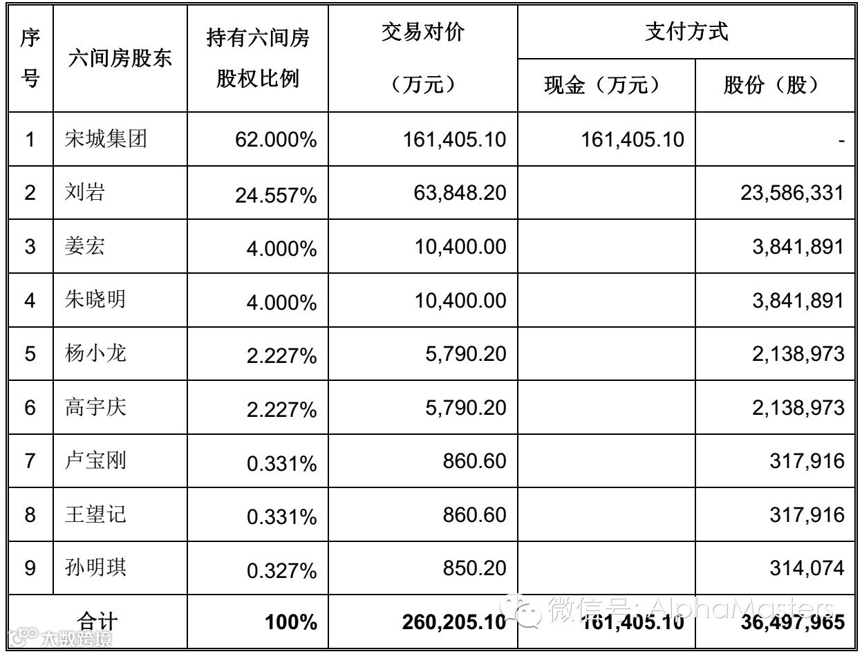 3月18日,宋城演艺公告,以现金形式向宋城演艺支付交易对价16.14亿元,收购六间房62%股权;以发行股份形式向刘岩等8人支付交易对价9.88亿元,收购六间房38%股权,股票发行价格27.07/股,共发行36,497,965股。具体如下: