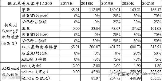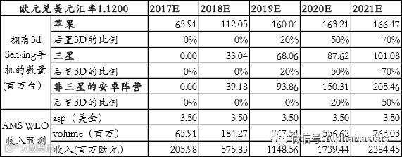 该项收入并未加入盈利预测模型中,但做了Sensor收入对于3D Sensing渗透率与AMS所占整体市场规模份额的敏感性分析,其中未考虑后置3D Sensing对于市场规模的影响。