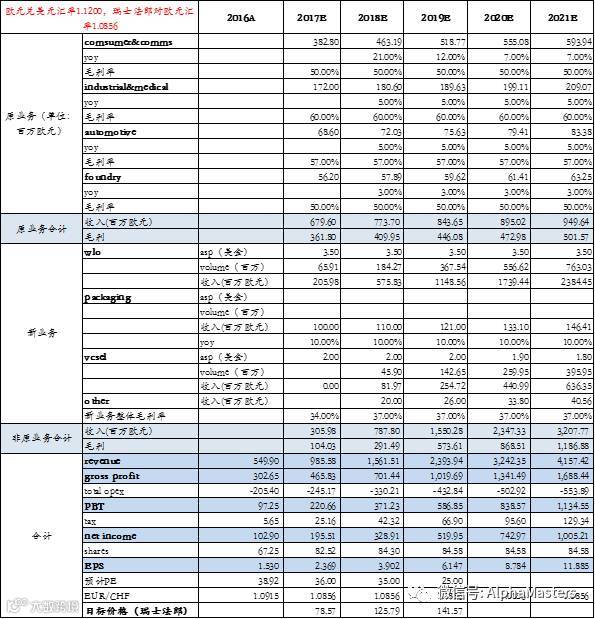 我们预测AMS在2017-2019年EPS2.369、3.902和6.147欧元,按照18年35倍PE、19年25倍PE计算,未来1年内看到目标价125.79-141.57瑞士法郎。