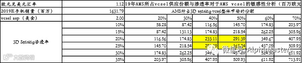 对2019年AMS在VCSEL方面的收入做了一个关于3D Sensing渗透率与AMS所占整体市场规模份额的敏感性分析,其中未考虑后置3D Sensing对于市场规模的影响。