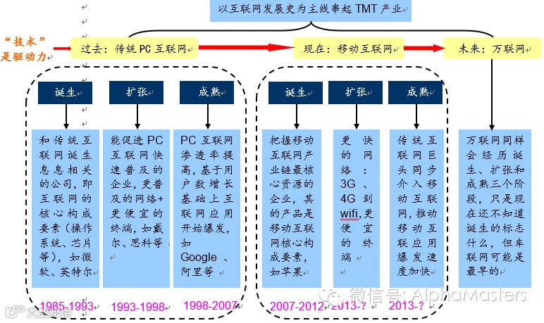以时间为轴,以传统互联网的历史为主线,可以将过去20余年TMT产业的发展依据传统互联网的发展史分为诞生、成长和成熟这三个阶段。