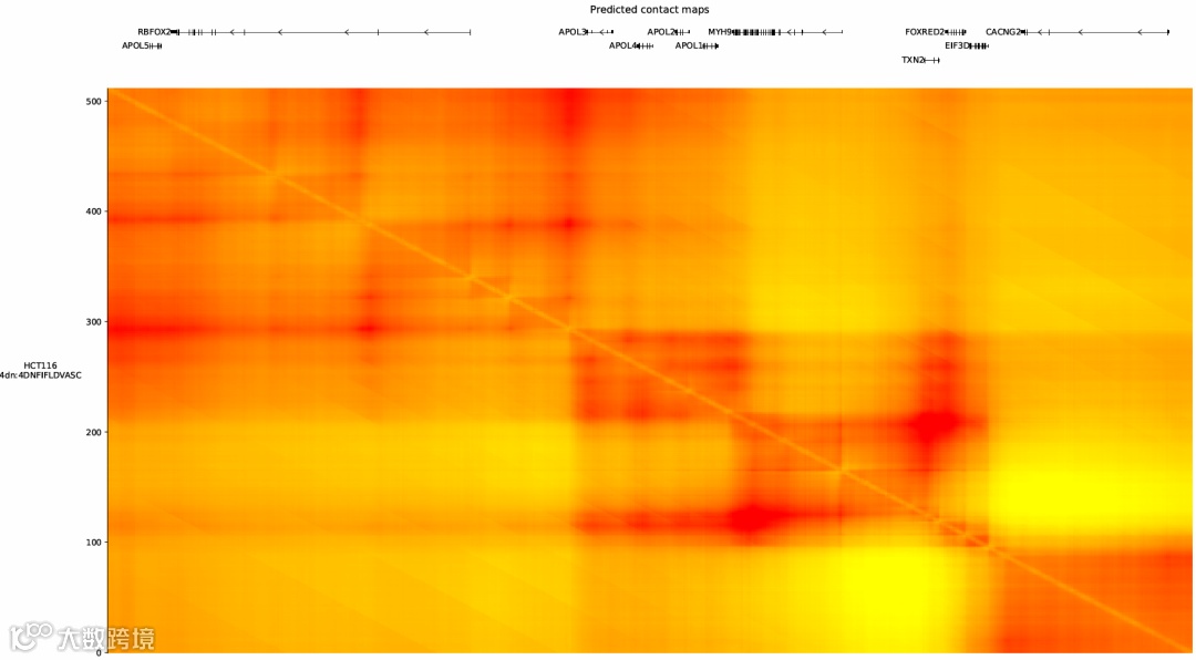 #加载函数组件from alphagenome.data import genomefrom alphagenome.data import gene_annotation, genome, track_data, transcriptfrom alphagenome.models import dna_clientfrom alphagenome.visualization import plot_componentsimport matplotlib.pyplot as pltimport numpy as npimport pandas as pdAPI_KEY = 'APIforUserDeep@Minds20250708'model = dna_client.create(API_KEY)# Load gene annotations (from GENCODE).#加载序列注释文件gtf = pd.read_feather('https://storage.googleapis.com/alphagenome/reference/gencode/''hg38/gencode.v46.annotation.gtf.gz.feather')# Filter to protein-coding genes and highly supported transcripts.gtf_transcript = gene_annotation.filter_transcript_support_level(gene_annotation.filter_protein_coding(gtf), ['1'])# Extractor for identifying transcripts in a region.transcript_extractor = transcript.TranscriptExtractor(gtf_transcript)# Also define an extractor that fetches only the longest transcript per gene.gtf_longest_transcript = gene_annotation.filter_to_longest_transcript(gtf_transcript)longest_transcript_extractor = transcript.TranscriptExtractor(gtf_longest_transcript)ontology_terms = ['EFO:0002824', # HCT116 colon carcinoma cell line.]# 构建序列对象并执行功能预测函数interval = genome.Interval(chromosome='chr22', start=35677410, end=36725986)longest_transcripts = longest_transcript_extractor.extract(interval)output = model.predict_interval(interval=interval,requested_outputs={dna_client.OutputType.CONTACT_MAPS},ontology_terms=ontology_terms,)# 视化绘制相互作用图plot = plot_components.plot([plot_components.TranscriptAnnotation(longest_transcripts),plot_components.ContactMaps(tdata=output.contact_maps,ylabel_template='{biosample_name}\n{name}',cmap='autumn_r',vmax=1.0,),],interval=interval,title='Predicted contact maps',)plt.tight_layout()plt.savefig('variant_contactmap_plot.pdf', format='pdf', bbox_inches='tight')plt.show()